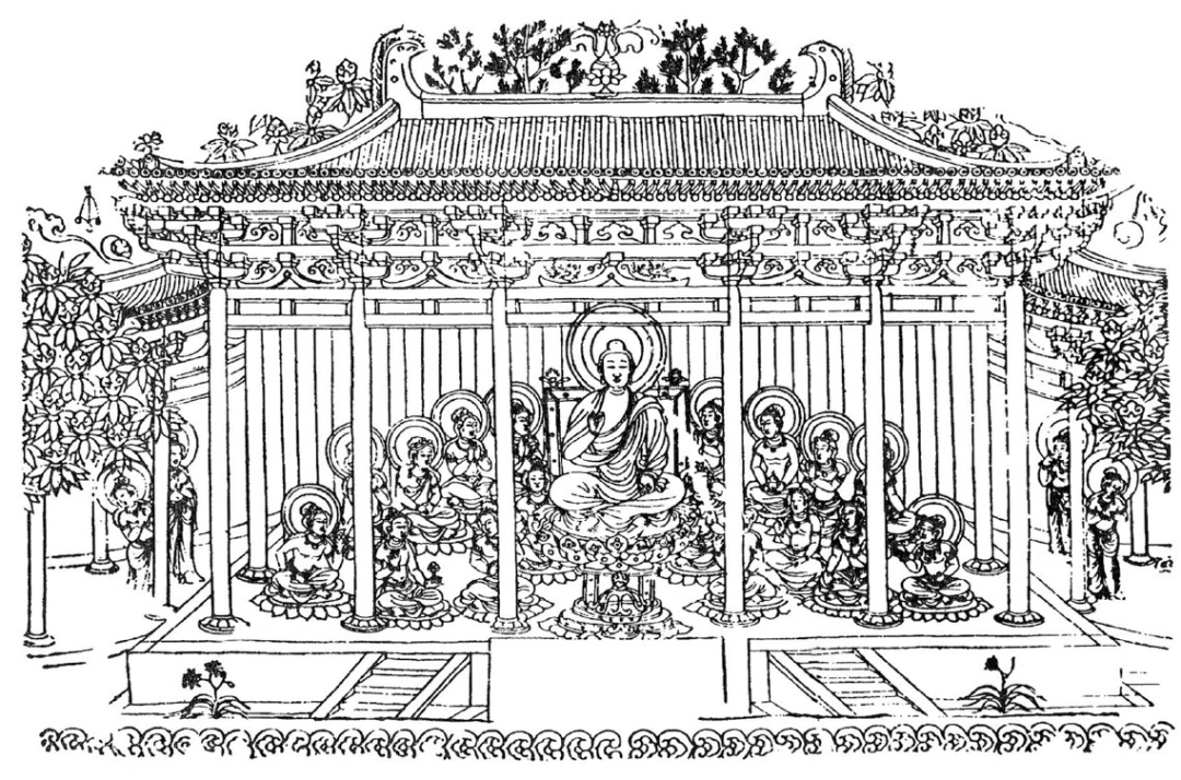 属于盛唐时代的一件罕贵参考资料是西安慈恩寺大雁塔西面门楣石上阴刻的佛殿图。图中柱、枋、斗栱、台基、椽檐、屋瓦,以及两侧的回廊,都用极精确的线条画出。大雁塔建于唐武则天长安年间(701—704),以门楣石在工程上难以移动的位置和图中所画佛殿的样式来推测(与后代建筑和日本奈良时代的实物相比较),门楣石当是八世纪初原物。由这幅图中,我们可以得到比敦煌大多数变相图又早约二百年的比较研究资料。