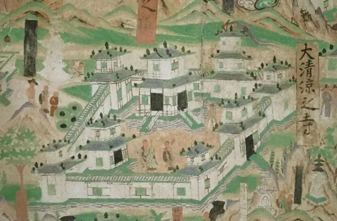 第六十一窟“五台山图”有伽蓝约六十余处,绝大多数都是同样的配置;其中“南台之顶”,正殿之前,左有三重塔,右有重楼,与日本奈良的法隆寺(7世纪)的平面配置极相似,日本的建筑史家认为这种配置是南朝的特征,非北方所有,我们在此有了强有力的反证,证明这种配置在北方也同样地使用。